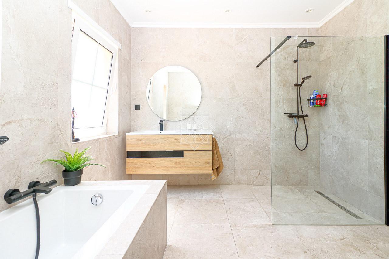 The villa welcomes you with a spacious entrance hall, leading to a living room with an open-plan dining area and a gas fireplace. The living space seamlessly flows to the outdoor terrace, offering picturesque views of the garden, pool, and golf course. The master bedroom features a walk-in wardrobe and a newly renovated ensuite with a bath and shower, while the other three double bedrooms each have their own ensuite bathroom. All bathrooms have underfloor heating, and the villa is fully air-conditioned.